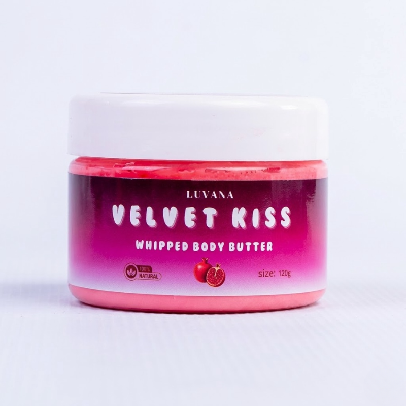 Velvet Kiss Body Butter deeply nourishes and hydrates, leaving your skin soft, smooth, and delicately scented with pomegranate, strawberry musk, and a soft Burberry Her-inspired fragrance. Enriched with natural butters and oils for a luxurious touch.