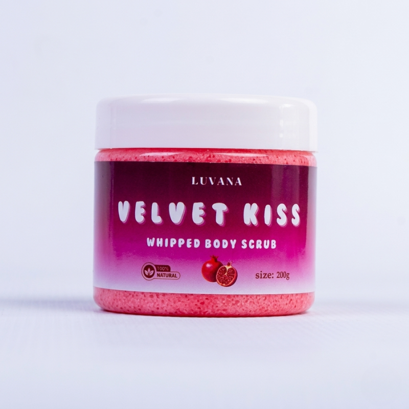 Velvet Kiss Body Scrub gently exfoliates and nourishes, leaving your skin soft, smooth, and delicately scented with pomegranate, strawberry musk, and a soft Burberry Her-inspired fragrance. Enriched with natural butters and oils for a luxurious, pampering touch.